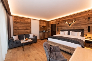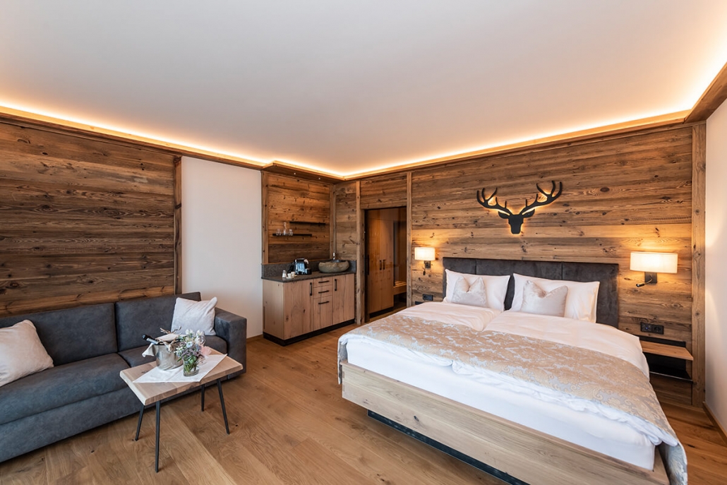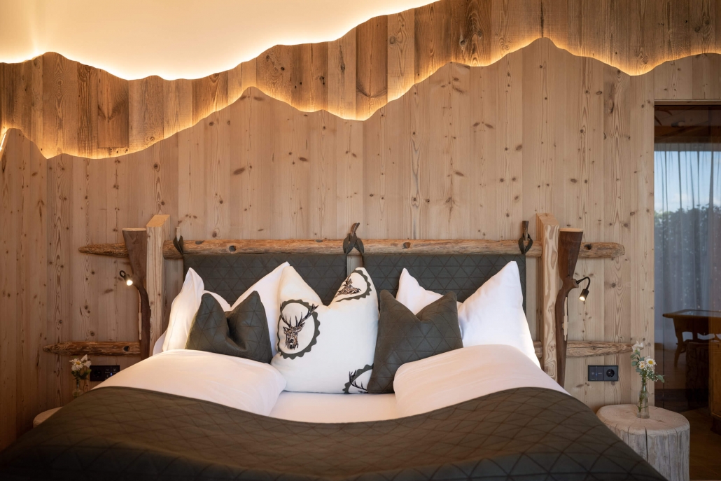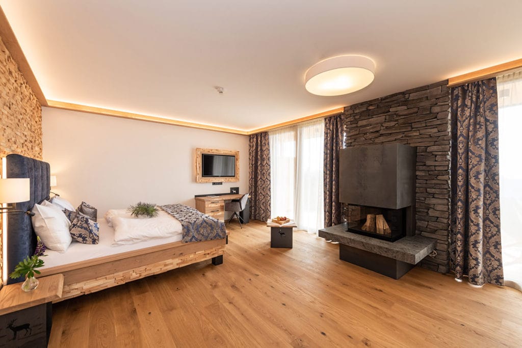 Le camere dell’hotel, spaziosamente arredate con legno antico, pietra e splendidi tessuti, ispirano ogni ospite.