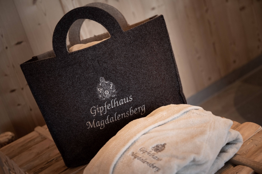 Il nostro accappatoio brilla con il logo individuale del Gipfelhaus, oltre a una moderna e pratica borsa wellness con ricami di design.