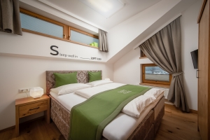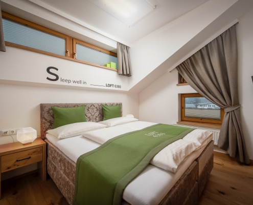 L’Albergo Fischer ha optato per una biancheria da letto a pois chiari intessuta su se stessa, in quanto si abbina al letto dell’albergo.